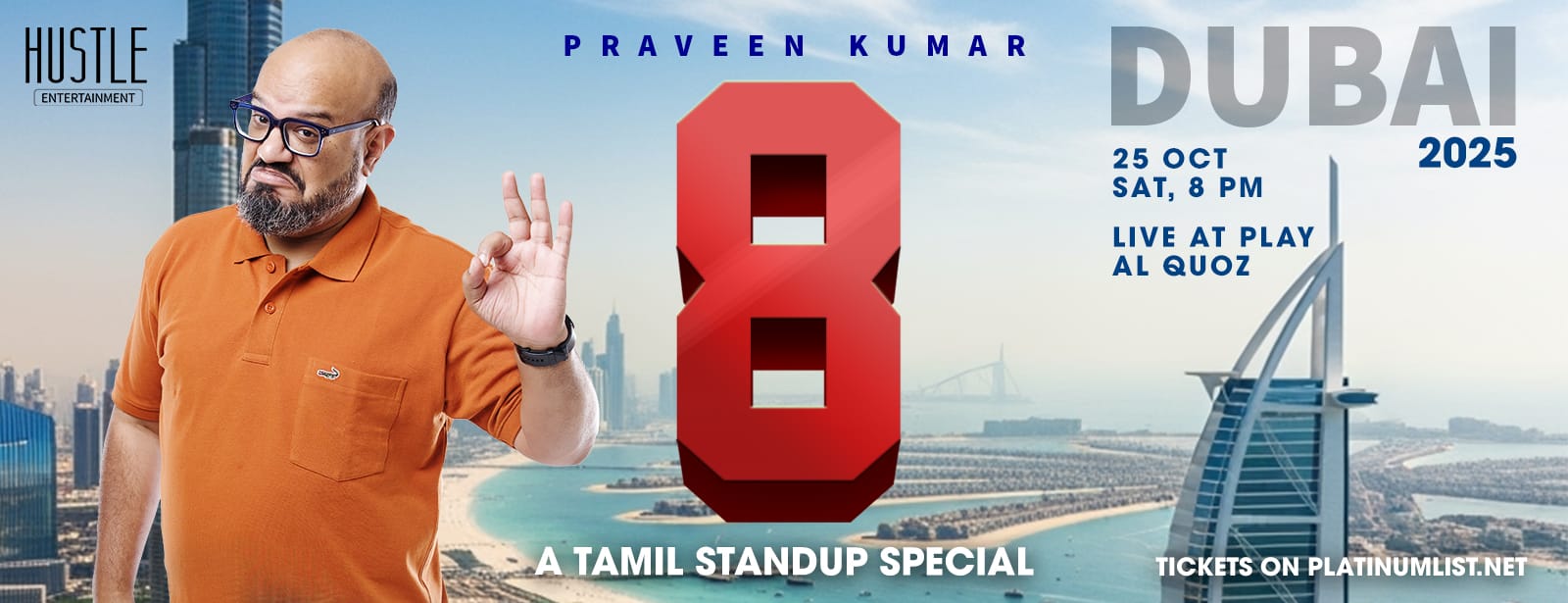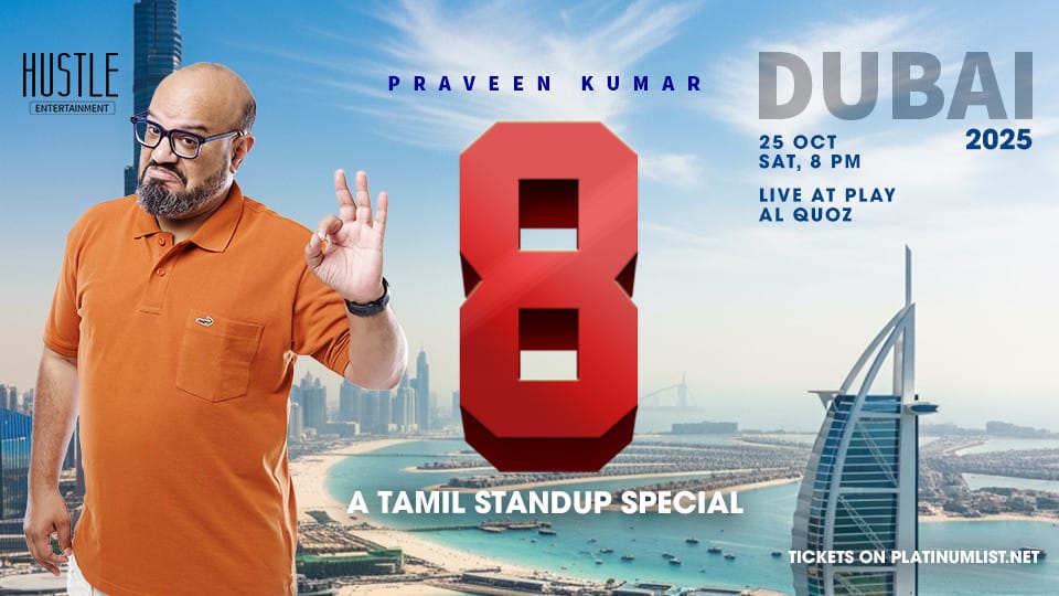 . Get ready to laugh your way through the chapters of life with โ8โโPraveen Kumarโs brand-new stand-up special and his eighth one yet!ย Inspired by his all-time favorite, Superstar Rajinikanth, and the legendary film โBaasha,โ Praveen shares eight hilarious stories from eight unforgettable stages of his own journey. From childhood mishaps to grown-up chaos, every moment is packed with the sharp wit and relatable humor fans have come to love.ย With over 15 million views on YouTube and a seat as a judge on Comicstaan, Praveen Kumar is one of Indiaโs top comedy voicesโand heโs bringing the laughs like never before. Donโt miss this fun, nostalgic, and side-splitting ride through lifeโs most entertaining moments. Grab your tickets now and be part of the comedy event everyone will be talking about! 8 – A Tamil stand up comedy show by Praveen Kumar at Live at play, ABA AVENUE, @play, 24B Street, Dubai, United Arab Emirates events Shows and Theatrical Plays Live@Play by Hive, Al Quoz Praveen Kumar