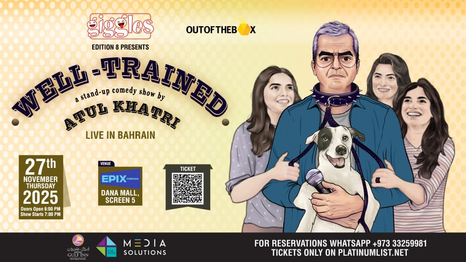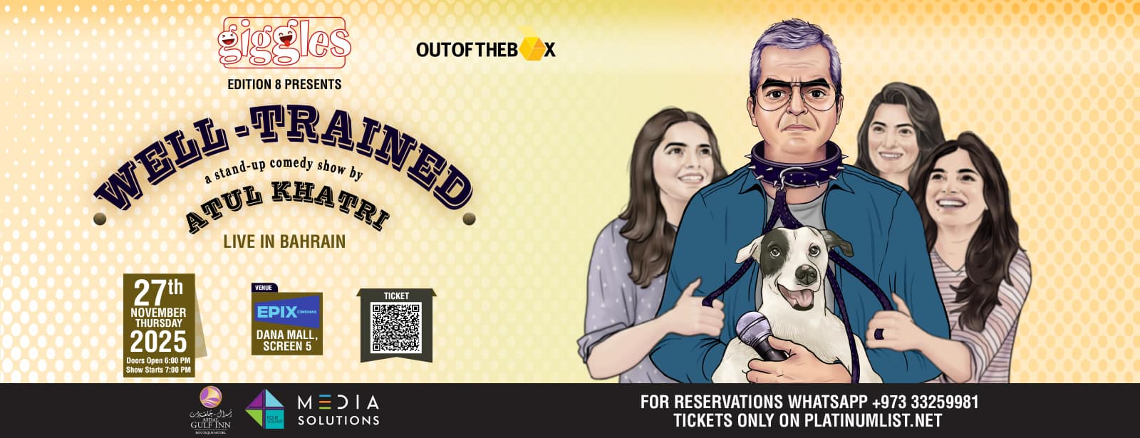 Mark your calendars for Thursday, 27th November 2025 at EPIX Cinemas, Dana Mall โ Screen 5. Doors open at 6:00 PM and the show kicks off at 7:00 PM sharp. Organized by Out of the Box and supported by Media Solutions, this is a comedy event you donโt want to miss. Donโt miss the chance to see one of Indiaโs top comedians liveโget your tickets now and prepare for a night filled with giggles and good vibes! Prepare yourself for a hilarious evening as Giggles Edition 8 proudly showcases Well-Trained, featuring Indiaโs top comedian, Atul Khatri, live in Bahrain!