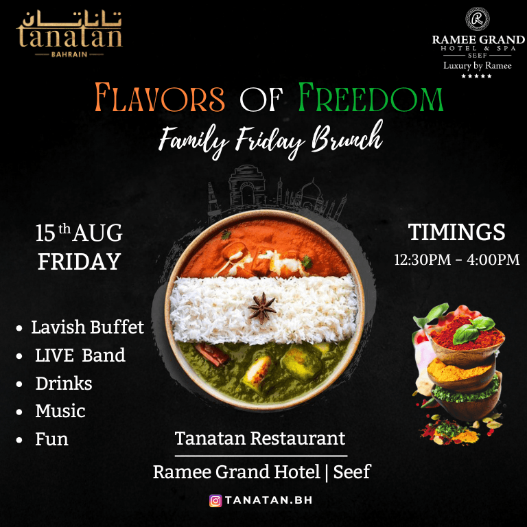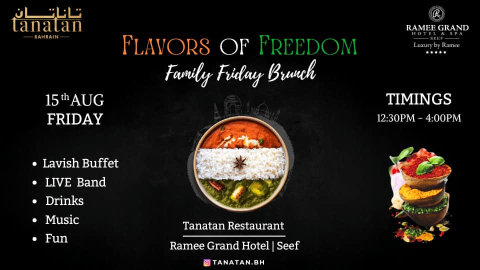 ย Join us on 15th August (Friday) for Family Friday Brunch to indulge in the best of desi cuisine with a mouthwatering buffet featuring live counters that will leave your taste buds tingling! Enjoy the vibrant ambience filled with liveย entertainment by an Indian couple band that will keep you grooving throughout the event with hypnotic Bollywood music!ย ย Experience an unforgettable celebration with your loved ones while savouring the exquisite flavours of authentic Indian cuisine! Family Friday Day – Independence Day Special at Tanatan Indian Restaurant – Ramee Grand Hotel at Rd 2813, Seef, Bahrain events Desi Events Ramee Grand Hotel & Spa
