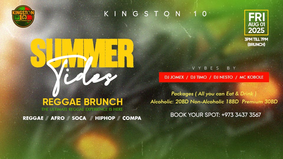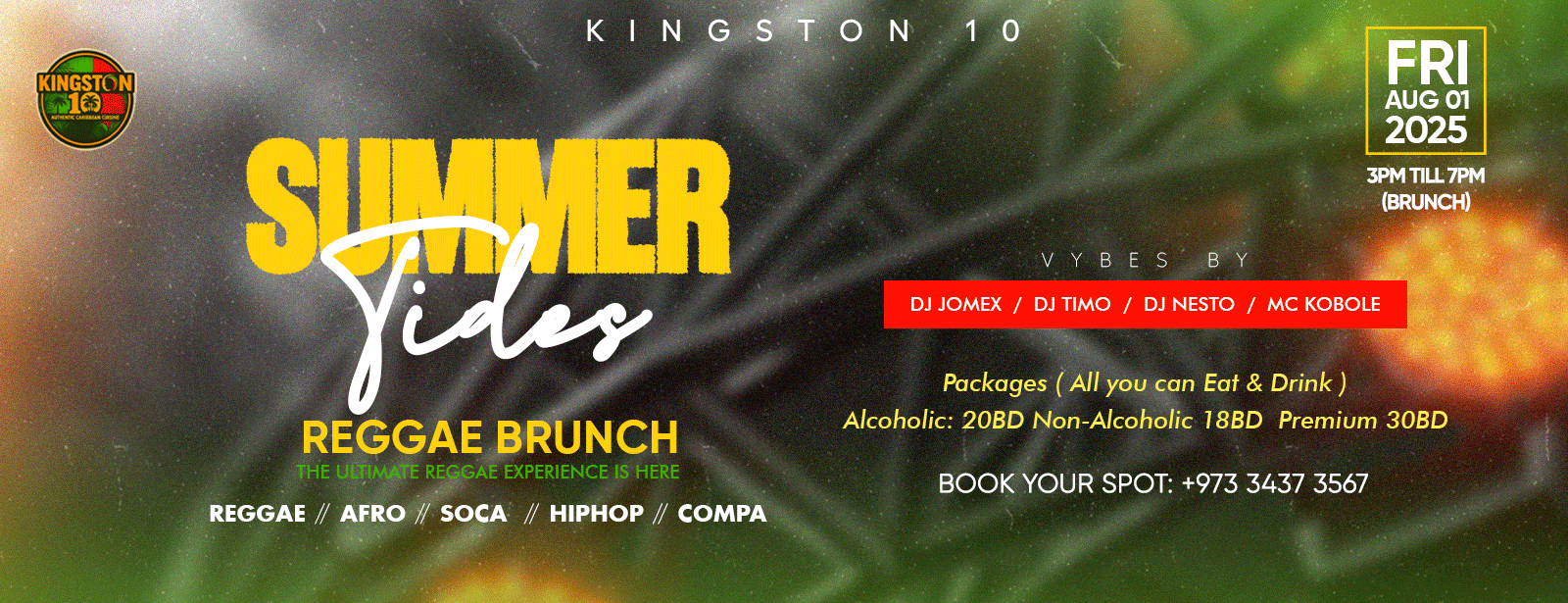 ย DJ Nesto, DJ Timo, Dj Jomax and MC Kobole. Summer Tides Reggae Brunch at Kingston10 at 6J86+89 Manama events Brunches Kingston10 – Elite Crystal Hotel